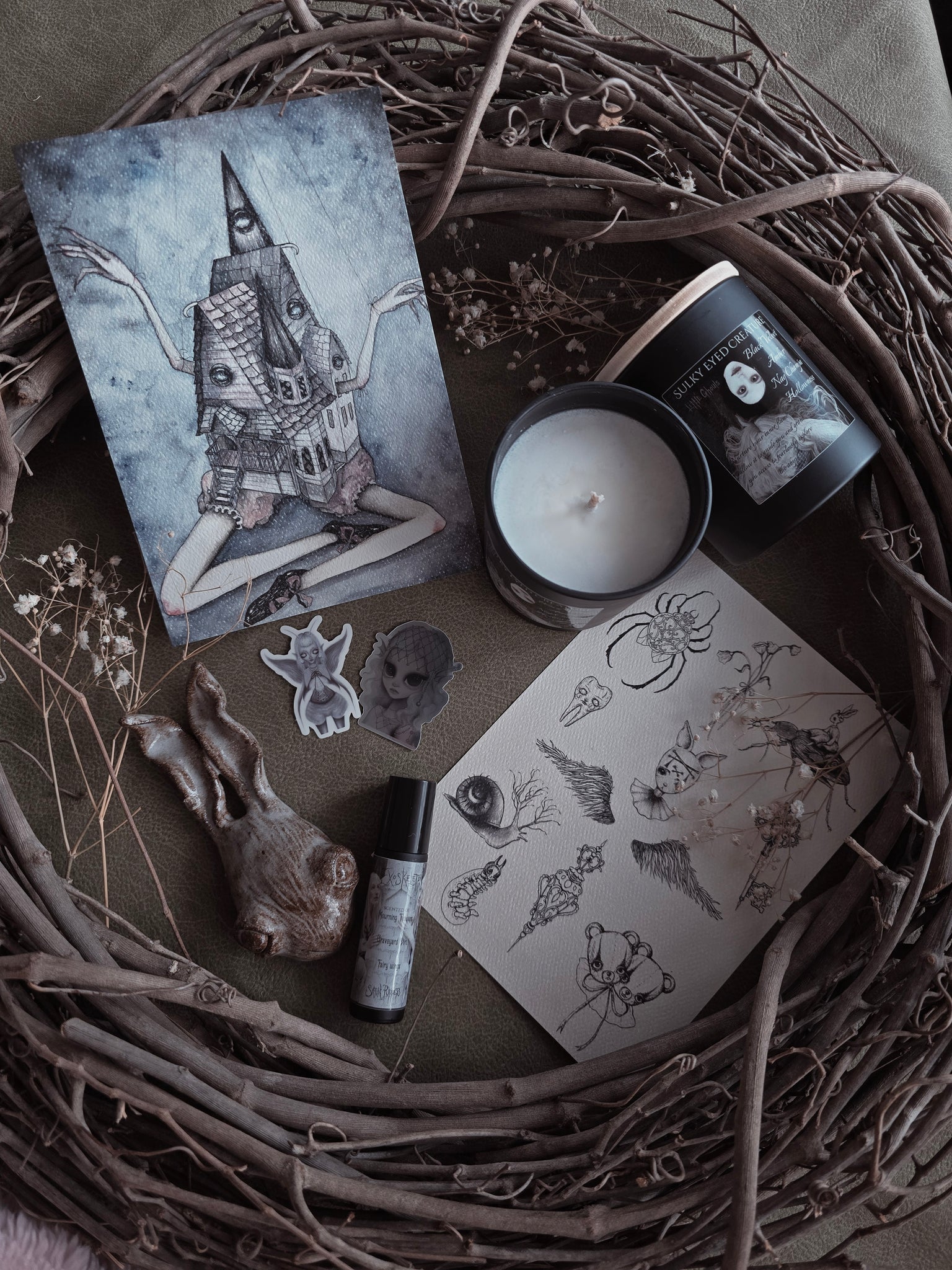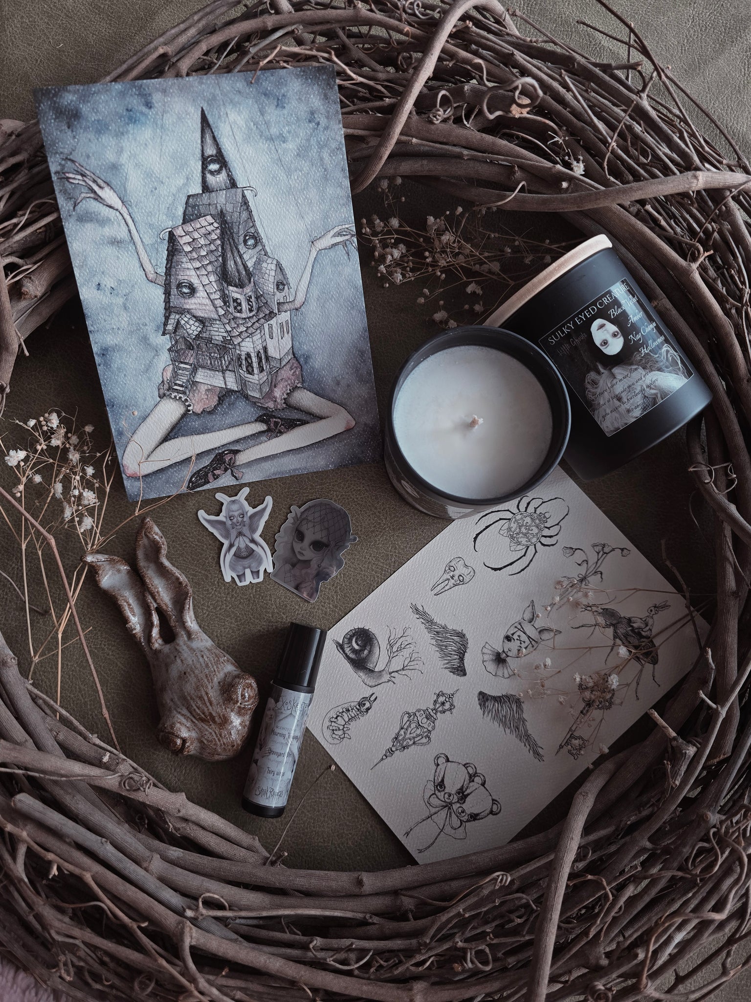 1 Mystery original artwork (this mystery item could be an original painting, a poppet, a wand, anything handmade)